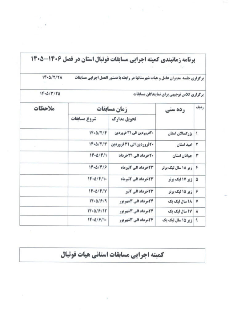 برنامه زمانبندی کمیته اجرایی مسابقات فوتبال استان در فصل 1406 – 1405