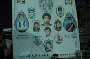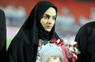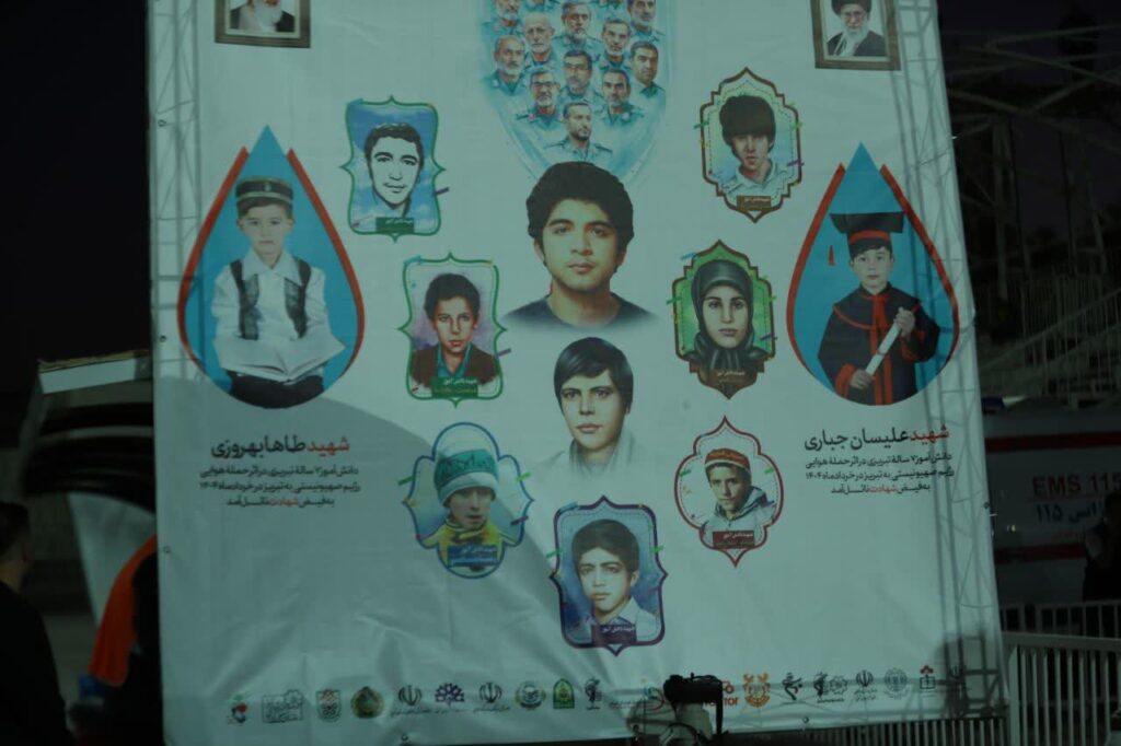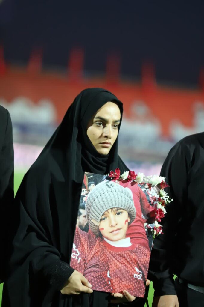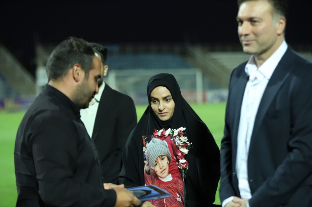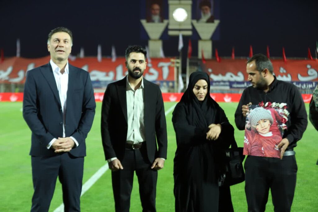 در این آئین مادر شهید طاها بهروزی با تصویری از فرزندش در دست در کنار زمین حضور یافت؛ عکسی که طاها را با پیراهن سرخ تیم محبوبش تراکتور تبریز نشان میداد.